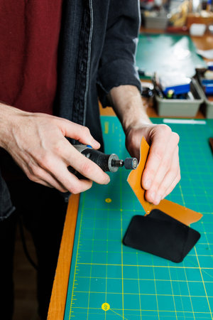 Making a leather case for batteries by a tanner, on a green self-healing mat, leather craftsmanship concept