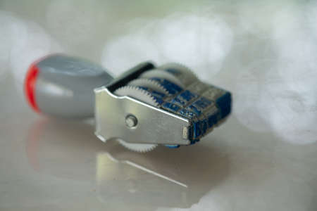 Details of a dirty shaver head disassembled for cleaning on a light background. Soft selective focus. Copy space
