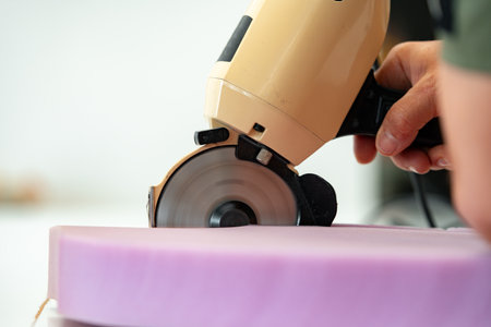 Hands of a furniture master cut a piece of foam with foam cutting machine