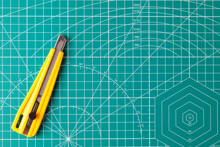 Utility knife and grid lines on a teal cutting mat indicating precision