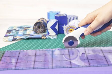 Fragments of a quilt, accessories for patchwork. The seamstress's hand cuts the fabric for the quilt. mat mat for patchwork, ruler, knife