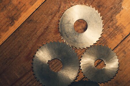 Circular saw blades. carpentry tools. industrial background. equipment for sawmill and sawing wooden products