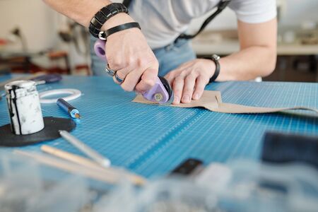 Close-up of unrecognizable workman with rings cutting edge of leather on cutting mat in craft studio