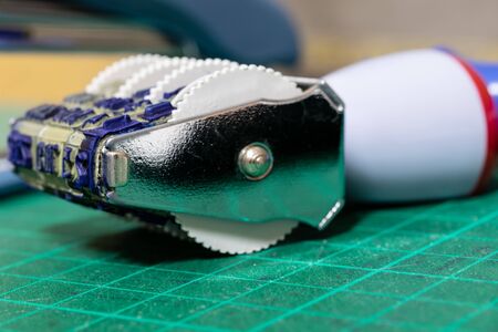 The blue paper guillotine used during the home office. Paper cutter blue background