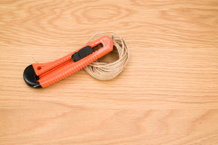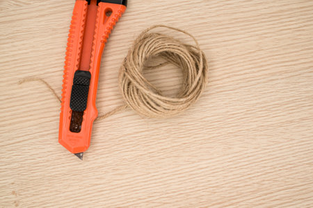 decorative cord and orange cutter on a wooden worktop with text space