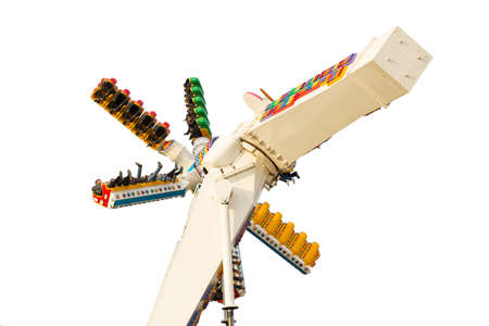 People who enjoy the attraction. High in the sky, a fun family day in an amusement park. Isolated on white background