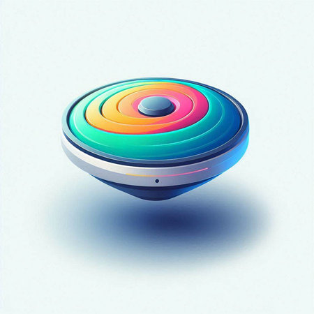 A metal spinning top dances gracefully on a reflective surface, creating mesmerizing spirals of blue and purple light in a dimly lit room, showcasing the beauty of motion and physics.