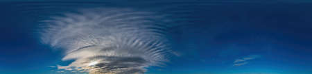 Blue sky with Cirrus clouds Seamless panorama in spherical equirectangular format. Complete zenith for use in 3D graphics, game and for composites in aerial drone 360 degree panoramas as a sky dome