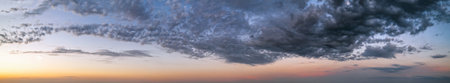 Fluffy clouds in evening sunset sky panoramic view. Climate, environment and weather concept cloudscape background.
