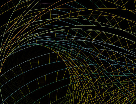 An abstract, colorful geometric tunnel formed by a rainbow-colored wireframe structure creates a mesmerizing vortex effect against a dark background.