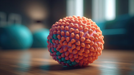 Highly detailed 3D rendering of a virus particle, featuring vibrant spike proteins and a textured surface, highlighting concepts in virology and microbiology.