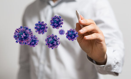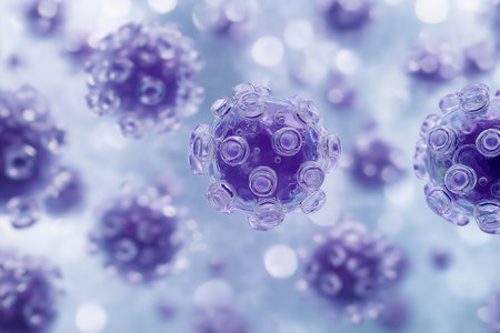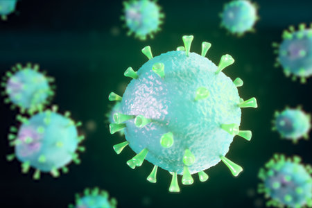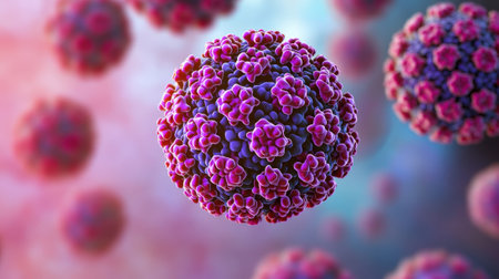 A detailed close-up of virus particles under a microscope, highlighting the intricate structure and spread.
