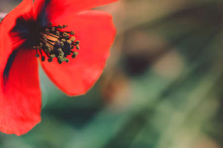 Cropped red poppy flower blossom lighted by the sun on nature background.