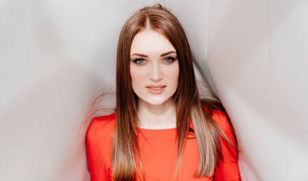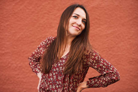 Outdoor portrait of pretty young woman with long straight brown hair, posing on terracotta color wall background