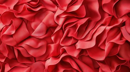 A close-up view of vibrant red fabric featuring a soft, ruffled texture. This beautiful material is perfect for creating elegant backgrounds, crafts, and fashion designs.