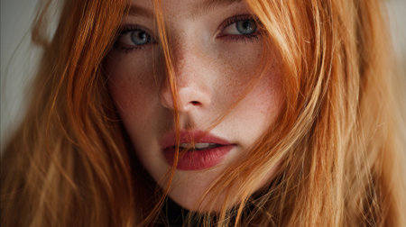 A young woman with vibrant red hair and captivating blue eyes gazes directly at the viewer. Soft lighting highlights her freckles and creates a warm atmosphere around her.