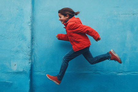 A young child wears a bright red jacket, energetically bounding across a striking blue wall.