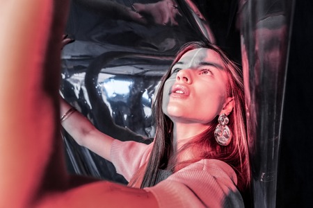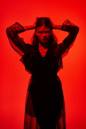 Fashion shot. Beautiful female model posing in black fashionable clothes in red light. Studio portrait.