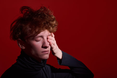 Young man lightly pressing his face with eyes closed while standing against vivid red background. His hair is tousled and he is wearing dark clothing