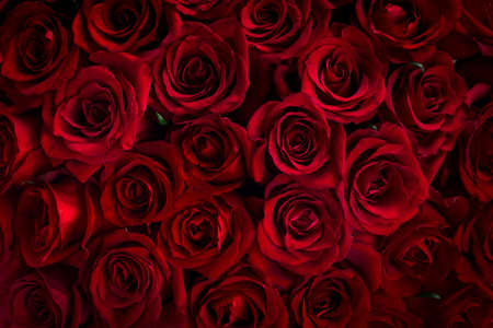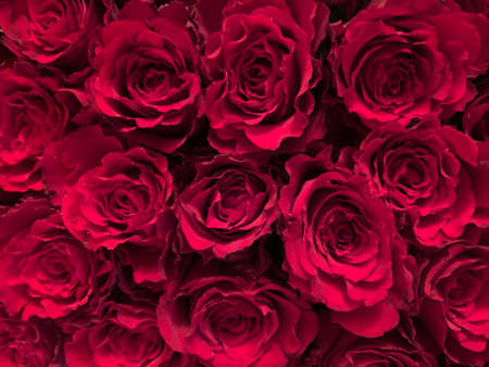 A close up of a bunch of red roses. The roses are arranged in a way that they are all facing the same direction, creating a sense of unity and harmony