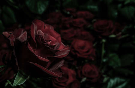 Blooming burgundy rose against the background of blurred bouquets of roses. A perfect and lovely rose for a gift. Postcard for the holiday.