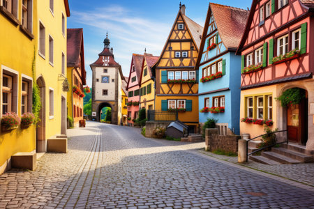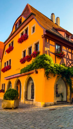 Cobblestone streets, colorful historic buildings and flowers in medieval Rothenburg ob