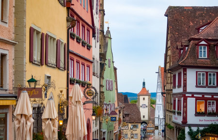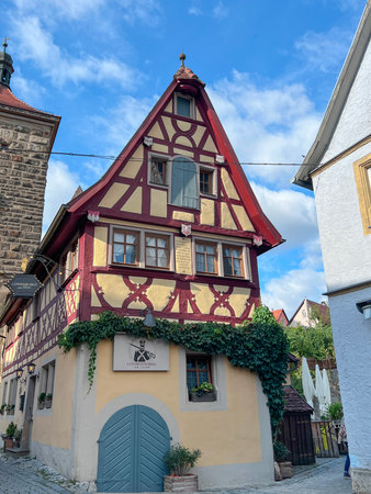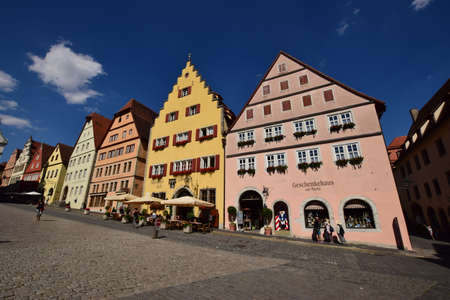 Rothenburg ob der Tauber, Germany - August 16, 2021: scenic view to old historic houses in Rothenburg ob der Tauber.