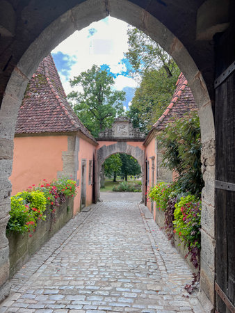 View through the Burgtor city gate on the gardens in the medieval German town of Rothenburg ob der Tauber, Bavaria