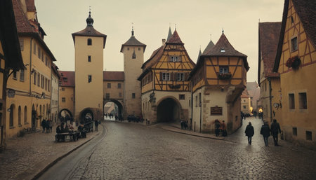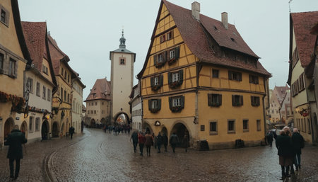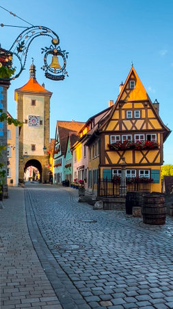 The historic streets of Rothenburg ob der Tauber in Germany, with half-timbered houses and cobblestone paths