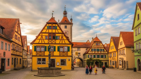 Rothenburg ob der Tauber, Germany - October 20, 2023: People going near historical buildings at Rothenburg ob der Tauber - old fortified city in Germany.