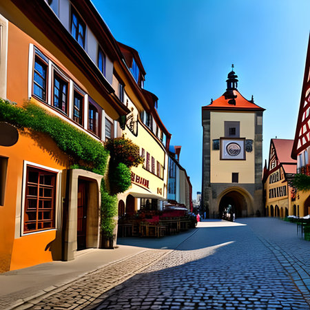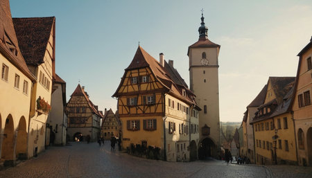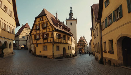 A sun-drenched cobblestone street in a charming medieval German town, lined with traditional half-timbered houses and a few people strolling.