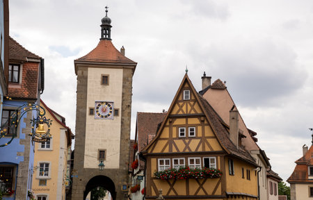 German traditional architecture half-timbered houses in historical center Rothenburg ob der Tauber, Bavaria, Middle Franconia, Germany, July 17, 2023.