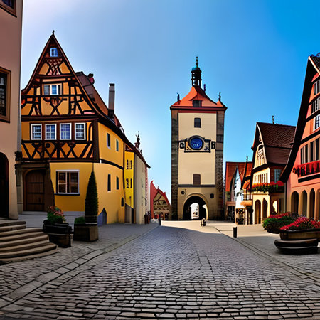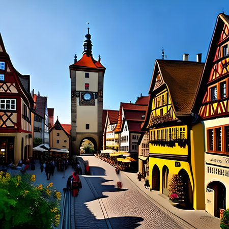 A sunlit medieval town square in Germany charming half-timbered houses and a prominent clock tower under a clear blue sky.