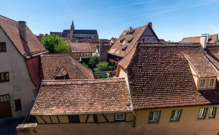View from town wall of facades and roofs of medieval old town Rothenburg ob der Tauber, Bavaria, Germany.