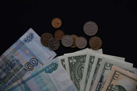 Banknotes and coins of the Russian ruble. Details of Russian money in close-up.The inscription Russian Federation on the coin.