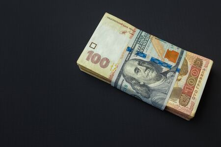 Value of Ukrainian hryvnia and American dollars. A pack of Ukrainian hryvnia wrapped one hundred dollar bill