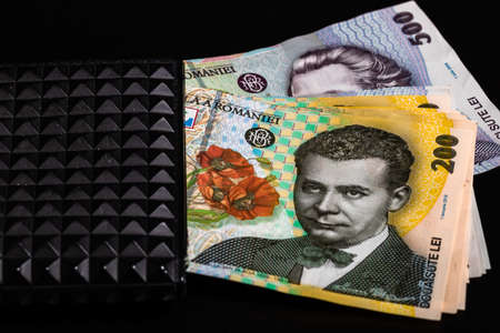 Selective focus on detail of lei banknotes. Close up macro detail of romanian lei banknotes, 200 lei isolated. World money concept, inflation and economy concept