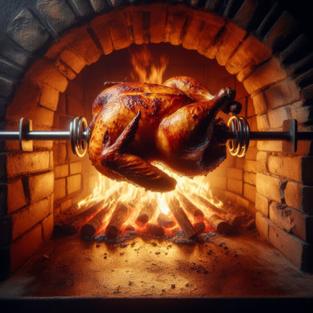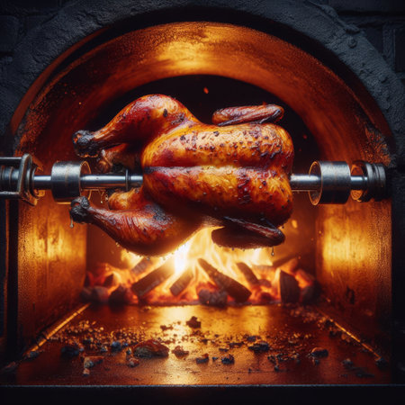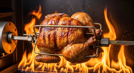 Golden roasted chicken rotating in a fiery oven, showcasing succulent barbecued cuisine.. AI Generation