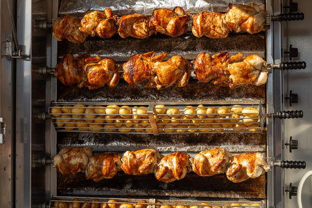 A commercial rotisserie oven at a market stall in Spain cooking whole chickens and potatoes at the same time. The potatoes are placed below the rotating chickens to collect drippings during cooking
