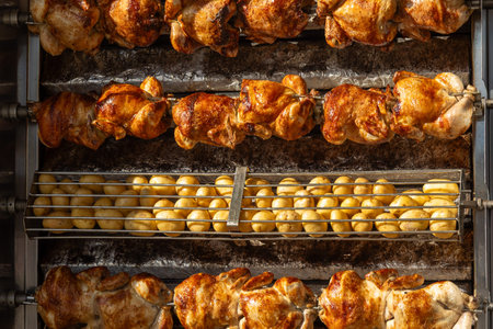 Roasted chicken in a row turning at industrial roaster