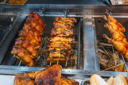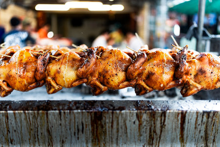 Grilled chicken is cooked at Asian street food night market in Vietnam