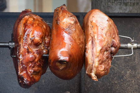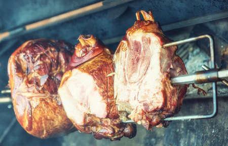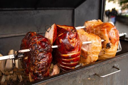 Hocks of ham slowly roasting over flames, street food, Czech Republic, Prague