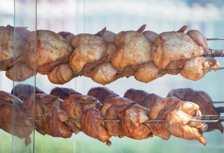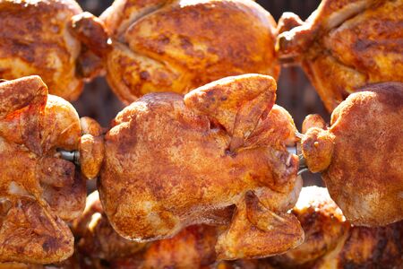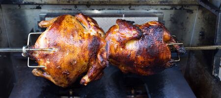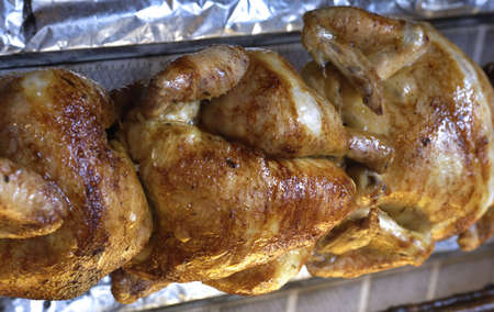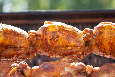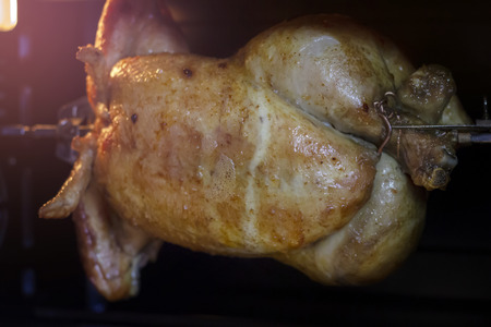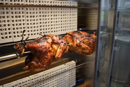 Grilled chicken on a spit. Fried chicken.