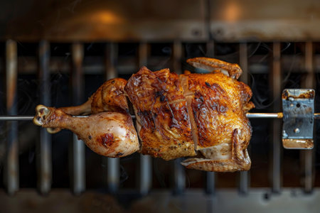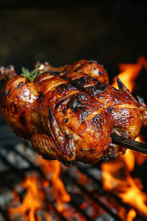 Rotisserie chicken, fire-roasted, succulent perfection, culinary close-up.