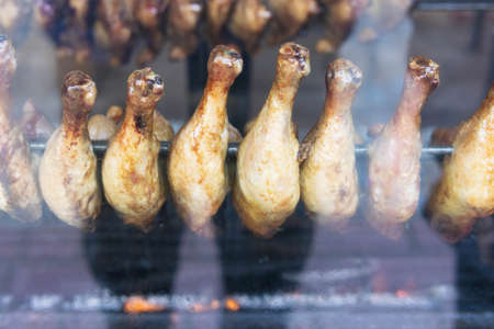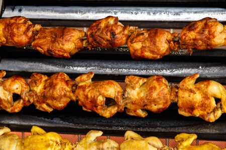 The homemade roasted chicken on skewers for street food background or texture.