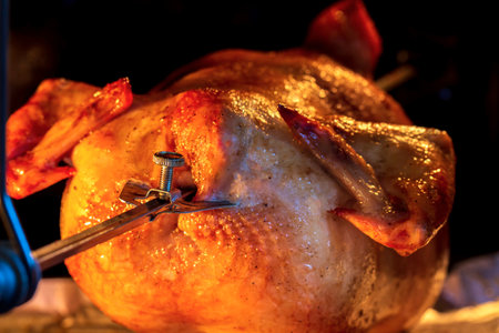 Grilled chicken in the oven. Roast poultry on a spit. Home cooking. Crisp. Natural product.