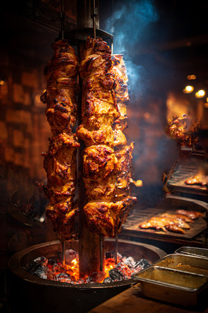 Professional chef skillfully slicing shawarma meat from a rotating spit in a commercial kitchen, preparing a popular street food dish