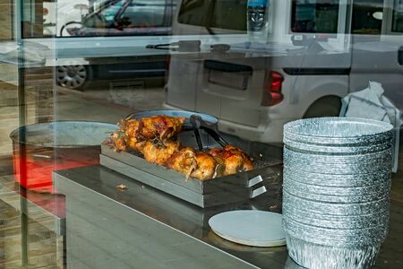 Delicious roasted chicken in a special grill oven near the grocery store. High quality photo