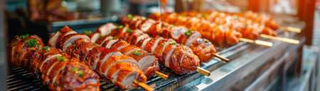A tantalizing display of roasted duck skewers hangs in shop windows along Bangkok's vibrant Yaowarat Road Golden-brown skin glistens under the streetlights, promising a taste of delicious Thai street food The skewers, expertly arranged, beckon hungry passersby to indulge in this culinary delight AI Generative