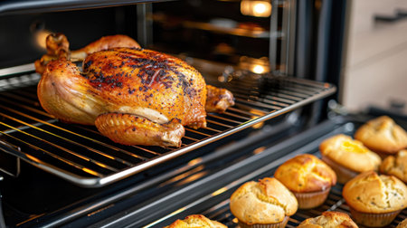A perfectly roasted chicken is placed on an oven rack, complemented by golden muffins baking below, showcasing a warm and inviting kitchen scene.